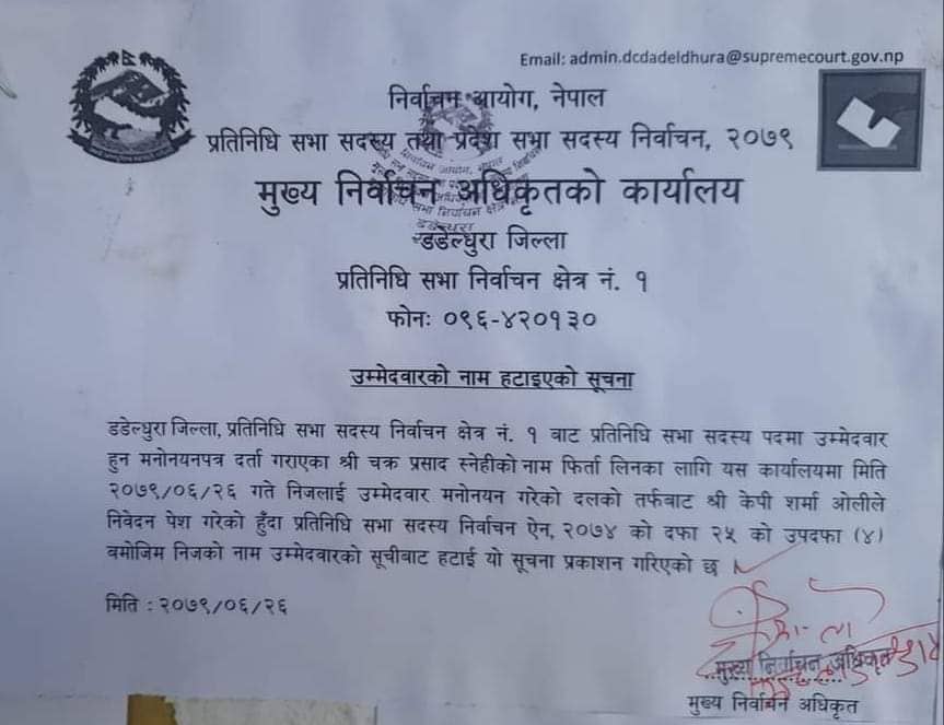 “उमेदवार मनोनयन गरेको दलको तर्फबाट केपी शर्मा अोलीले निवेदन पेस गरेको हुँदा प्रतिनिधि सभा सदस्य निर्वाचन ऐन, २०७४ को दफा २५ को उपदफा (४) बमोजिम निजको नाम उमेदवारको सूचीबाट हटाई यो सूचना प्रकाशन गरिएको छ,” सूचनामा भनिएको छ ।