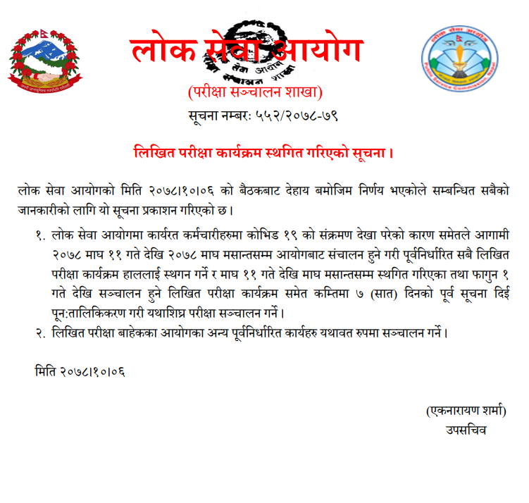 आयोगका उपसचिव एकनारायण शर्माले सूचना प्रकाशित गर्दै आयोगका कर्मचारीमा कोभिड–१९ संक्रमण देखिएकाले माघ ११ गतेदेखि माघ मसान्तसम्म सञ्चालन हुने गरी पूर्वनिर्धारित परीक्षा स्थगित गरिएका जनाएका छन् ।