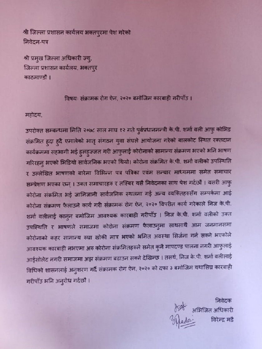 ‘यसरी आफु को’रोना संक्रम’ण फै’लउने कार्य गरी सं’क्रामक रोग ऐन २०२० विपरित कार्य गरेकाले निज केपी शर्मा ओलीलाई कानुन बमोजिम आवस्यक का’रवाही गरी पाउ’, निवेदकको दावी छ ।