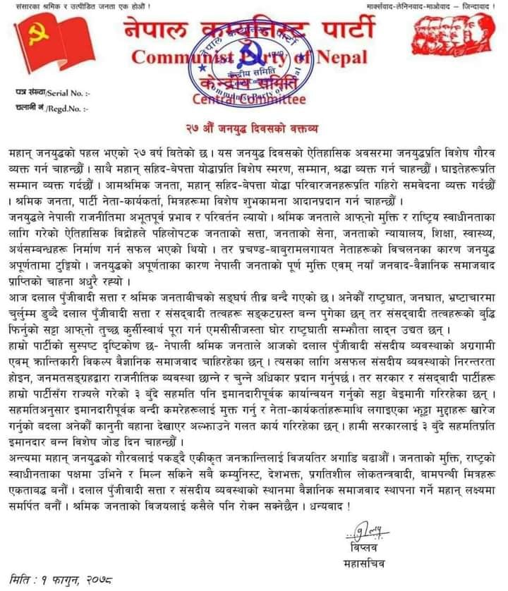 उनले भने, ’जनयुध्दले नेपाली राजनीतिमा अभूतपूर्व प्रभाव र परिवर्तन ल्यायो । श्रमिक जनताले आफ्नो मुक्ति र राष्ट्रिय स्वाधीनताका लागि गरेको ऐतिहासिक विद्रोहले पहिलोपटक जनताको सत्ता, जनताको सेना,जनताको न्यायालय, शिक्षा,स्वास्थ्य,अर्थसम्बन्धहरू निर्माण गर्न सफल भएको थियो ।