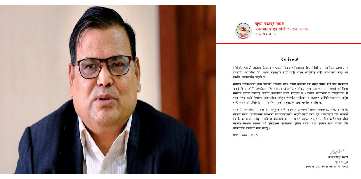 नेकपा माओवादी केन्द्रका प्रवक्ता तथा पूर्वसभामुख कृष्णबहादुर महराले एमसीसी जबर्ज’स्ती प्रतिनिधि सभामा पेस भएको घटनाप्रति गम्भीर ध्यानाकर्षण भएको बताएका छन् ।